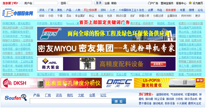 包含中國粉體網(wǎng)首頁個性關(guān)鍵詞服務(wù)、中國粉體搜索搜索關(guān)鍵詞排名服務(wù),給企業(yè)創(chuàng)造更多被潛在客戶找到的機會。另外,關(guān)鍵詞推廣相對翻牌廣告費用較低,是相關(guān)企業(yè)宣傳推廣自己的產(chǎn)品、提高企業(yè)知名度的一種非常行之有效的方法。